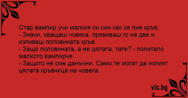 - Защо половината, а не цялата, тате? - попитало малкото вампирче.