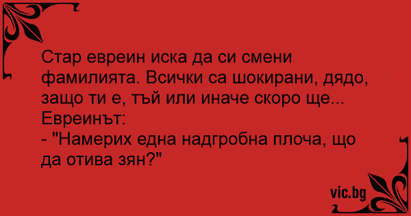 Стар евреин иска да си смени фамилията. Всички са шокирани, дядо, защо ти е, тъй или иначе скоро ще...