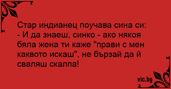 - И да знаеш, синко - ако някоя бяла жена ти каже "прави с мен каквото искаш", не бързай да й сваляш скалпа!