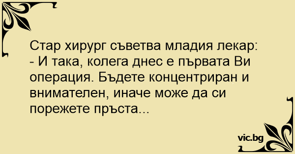 - И така, колега днес е първата Ви операция. Бъдете концентриран и внимателен, иначе може да си порежете пръста...