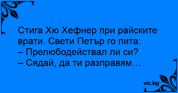Стига Хю Хефнер при райските врати. Свети Петър го пита:
