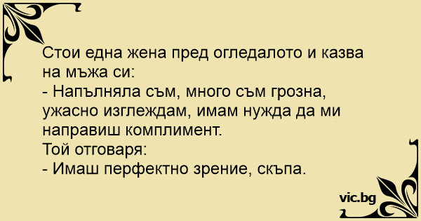 Ένα ζευγάρι Пред огледалото: Schatz, ich fühle mich heute so dick und gar nicht hübsch. Kannst du mir nicht ein Kompliment machen. Minha namorada estava nua na frente de um espelho e ela não estava feliz com o que via. Un matrimonio ya acostándose al final del día. Une femme dit à son mari : Η σύζυγος κοιτάζει τον εαυτό της μπροστά στον καθρέπτη. Стоит женщина перед зеркалом, ей не нравится свое отражение... Жена: This woman rushed to see her doctor, looking very much worried and all strung out. She rattles off: "Doctor, take a look at me. When I woke up this morning, I looked at myself in the mirror and saw my hair all wiry and frazzled up, my skin was all wrinkled and pasty, my eyes were bloodshot and... Une femme nue, se regarde debout devant la glace, elle dit à son époux : "Je me trouve horrible à regarder, grasse et ridée... J'ai besoin d'un compliment" Le mari répond : "Tu as une bonne vue !" Eine etwas in die Jahre gekommene Frau steht vor dem zu Bett gehen nackt vor dem Spiegel, lässt ihren Blick am Spiegelbild rauf und runter wandern und meint dann seufzend zu ihrem Mann: "Wenn ich... A woman is standing looking in the bedroom mirror… She is not happy with what she sees and says to her husband, “I feel horrible; I look old, fat and ugly… I really need you to pay me a... Mijn vrouw bekeek  zich in de spiegel en was niet tevreden met wat ze daar zag. Ik voel me verschrikkelijk, ik vind me oud,dik en lelijk. Ik heb het nodig dat je me onmiddellijk een compliment... Een koppel maakt zich klaar om te gaan slapen. De vrouw staat voor haar grote spiegel, en ze zegt: "Schatje, in de spiegel zie ik een oude vrouw. Mijn gezicht is vol rimpels, ik krijg al wat snor,... Due amici parlano del loro San Valentino. Uno racconta all'altro: "Ieri sera io e mia moglie dovevamo andare a cena fuori: avevo prenotato per le otto ed erano già le otto e un quarto quando lei... "Schatz?" "Ja?" "Ich fühle mich so hässlich, so fett und so faltig. Ich brauche ein Kompliment." "Du hast eine gute Beobachtungsgabe." A mulher esta nua, olhando no espelho do quarto de dormir. Ela não está feliz com o que vê e diz para o marido: — Sinto-me horrível. Pareço velha, gorda e feia... Eu realmente preciso de um elogio... A woman was standing naked, looking herself at the mirror. She was not satisfied with what she was looking at and said to her husband: "I feel awful. I look old, fat, and ugly. I really need a... Toen mijn vrouw in de spiegel keek zei ze: “Ik begin dik, oud en lelijk te worden, kan je me een compliment geven?” Dus ik antwoordde: “Je ogen zijn toch nog prima” O Marido chega para a esposa: " estou tão velho, feio, trite, gordo...preciso de um elogio." Ela: "Você tem uma ótima visão!" Kona står naken og ser seg selv i speilet. Hun sier til mannen: "Jeg er gammel, fet og stygg. Kan du ikke gi meg et kompliment?" Mannen: "Jo synet ditt er perfekt..." En kone sto foran speilet og så på seg selv. Hun var ikke fornøyd med det hun så og sa til mannen: - Jeg føler meg helt forferdelig, jeg ser så gammel og stygg ut. Jeg trenger virkelig at du gir... Kobita budzi się rano po Sylwestrze, patrzy w lustro i szturcha w bok wymęczonego imprezą męża: - Wiesz kochanie, jaka ja już jestem stara! Twarz mam całą pomarszczoną, biust obwisły, oczy sine i... Kobieta w kwiecie wieku staje przed lustrem i mówi do męża: - Ech... przybyło mi zmarszczek, utyłam, te włosy takie jakieś nijakie. Zbrzydłam. Powiedz mi kochanie, coś miłego... - Wzrok masz dalej... Kadın aynaya baktı ve kocasına dönüp: - Kendimi iğrenç buluyorum, çirkin ve yaşlanmış. Güzel bir iltifatına ihtiyacım var. Kocası: - Gözlerin çok iyi görüyor canım. En kvinna stod naken framför sovrumsspegeln. Hon var inte glad åt vad hon såg och sade till sin make: "Jag känner mig förfärlig. Jag ser gammal, fet och ful ut.Jag skulle verkligen behöva en... Ea: Iubitule, ma uit in oglinda si vad o femeie grasa si ridata, am urgent nevoie de un compliment... El: Ai o vedere excelenta! Marito e moglie in camera da letto. Lui è nel letto che sta leggendo il giornale, lei si guarda allo specchio davanti, di dietro, di fianco e poi dice al marito: "Amore mi vedo tanto grassa, sono... Une femme dit a son mari: - Cheri je me sens vieille, ridée et grosse. Fais moi un compliment. Le mari répond: - Tu sais quoi tu as une très bonne vue! Стоїть жінка перед дзеркалом, їй не подобається своє відображення ... Дружина: — Мені здається я страшна! Скажи мені який-небудь комплімент. Чоловік: — У тебе відмінний зір! Une femme se regarde dans le miroir : - Ah regarde comment je suis grasse et laide, j'ai vraiment besoin d'un compliment ! - Félicitation, tu as une éxélente vue ! Sieva stāv pie spoguļa, pēta sevi.. - Dārgais es esmu briesmīga! Pasaki kādu komplimentu… - Mīļā tev ir lieliska redze. Η γυναίκα μου στεκόνταν γυμνή μπροστά στον καθρέφτη και μου λέει: - Αισθάνομαι χάλια. Δείχνω γριά, χοντρή και άσχημη. Πες μου κάτι θετικό. Και της απάντησα: - Η όρασή σου όμως είναι τέλεια… Και... Az öregedő feleség áll a tükör előtt: - Jaj Istenem, teli vagyok ráncokkal, a mellem lecsüng a derekamig, a fenekem megereszkedett, egyre jobban őszülök... Erre a férj: - Drágám, viszont a látásod...