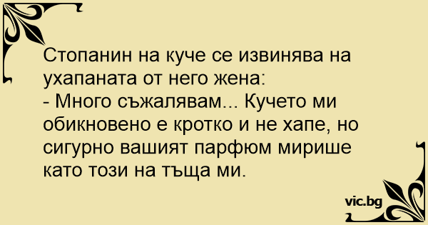 - Много съжалявам... Кучето ми обикновено е кротко и не хапе, но сигурно вашият парфюм мирише като този на тъща ми.