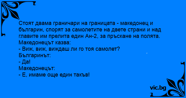 Стоят двама граничари на границата - македонец и българин, спорят за самолетите на двете страни и над главите им прелита един Ан-2, за пръскане на полята.