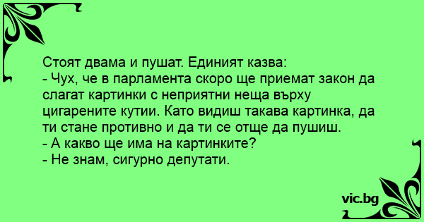 - Чух, че в парламента скоро ще приемат закон да слагат картинки с неприятни неща върху цигарените кутии. Като видиш такава картинка, да ти стане противно и да ти се отще да пушиш.