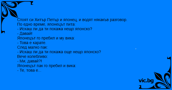Хитър Петър го отма'ал през главата с някакво желязо. Японецът след малко се надигнал окървавен и пита: