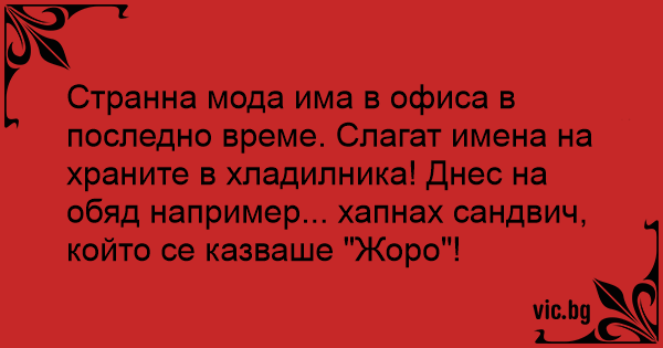 Странна мода има в офиса в последно време. Слагат имена на храните в хладилника! Днес на обяд например... хапнах сандвич, който се казваше "Жоро"!