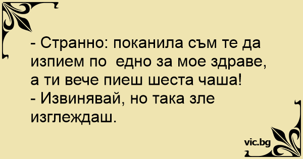- Странно: поканила съм те да изпием по едно за мое здраве, а ти вече пиеш шеста чаша!