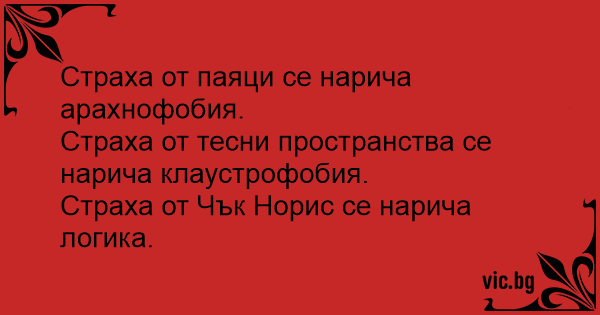 Fear of spiders is aracnaphobia, fear of tight spaces is chlaustraphobia, fear of Chuck Norris is called Logic.