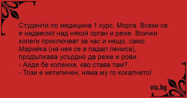 Студенти по медицина 1 курс. Морга. Всеки се е надвесил над някой орган и реже. Всички колеги приключват за час и нещо, само Марийка (на нея се е падал пeниca), продължава усърдно да реже и рови.