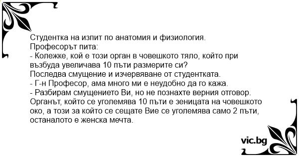 - Разбирам смущението Ви, но не познахте верния отговор. Органът, който се уголемява 10 пъти е зеницата на човешкото око, а този за който се сещате Вие се уголемява само 2 пъти, останалото е женска мечта.