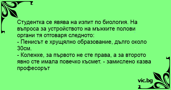 Студентка се явява на изпит по биология. На въпроса за устройството на мъжките полови органи тя отговаря следното: