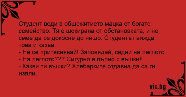 Студент води в общежитието мацка от богато семейство. Тя е шокирана от обстановката, и не смее да се докосне до нищо. Студентът вижда това и казва: