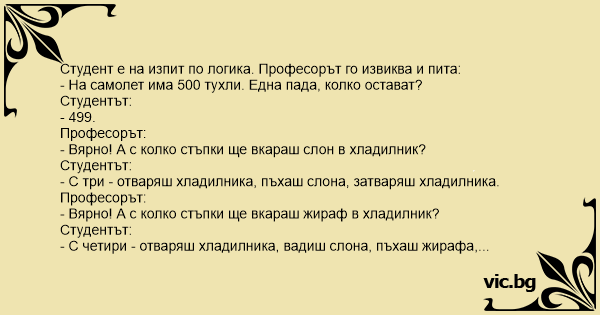 Йде іспит. Професор: — На борту літака 500 цеглин. Одна цеглина випала з літака. Скільки на борту залишилося цеглин? — Ну, це легко! 499! — Правильно. Наступне питання. Як покласти слона в...