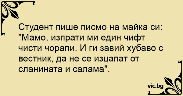 Студент пише писмо на майка си:<br />"Мамо, изпрати ми един чифт чисти чорапи. И ги завий хубаво с вестник, да не се изцапат от сланината и салама".