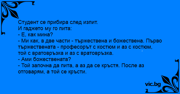 Колега како помина на испитот? Како у црква... Он чита прашањето, ја се крстам. Ја кажувам одговорите он се крсти.