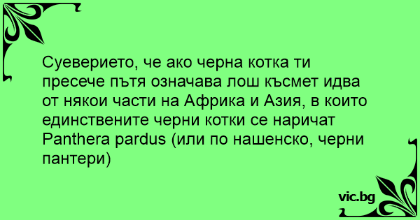 Суеверието, че ако черна котка ти пресече пътя означава лош късмет идва от някои части на Африка и Азия, в които единствените черни котки се наричат Panthera pardus (или по нашенско, черни пантери)
