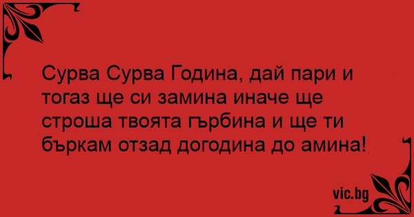 Сурва Сурва Година, дай пари и тогаз ще си замина иначе ще строша твоята гърбина и ще ти бъркам отзад догодина до амина!