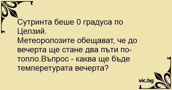 Метеоролозите обещават, че до вечерта ще стане два пъти по-топло.Въпрос - каква ще бъде темперетурата вечерта?