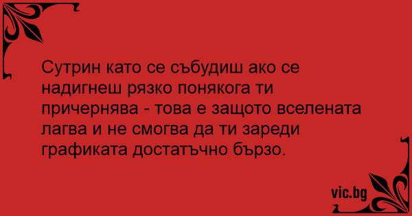 Сутрин като се събудиш ако се надигнеш рязко понякога ти причернява - това е защото вселената лагва и не смогва да ти зареди графиката достатъчно бързо.