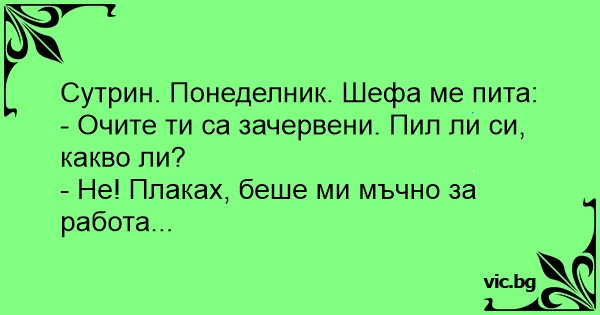Сутрин, понеделник, шефа пита: Утро. Понедельник. Начальник спрашивает: Ранок. Понеділок. - Очі у тебе опухлі, червоні ... Ти що - пив? - Ні, курва - плакав! Понеделнички шефот ме прашува: - Зошто ти се црвени очите, си пиел? - Не, плачев цел викенд, ми фалеше работата... Начальник зранку: — Очі у тебе опухлі і червоні. Ти що, пив? — Ні, блін, на роботу йти не хотів. Плакав.
