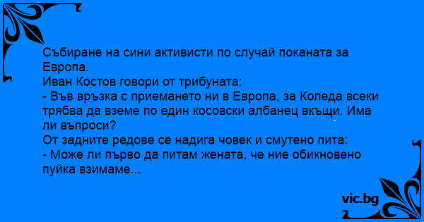 - Във връзка с приемането ни в Европа, за Коледа всеки трябва да вземе по един косовски албанец вкъщи. Има ли въпроси?