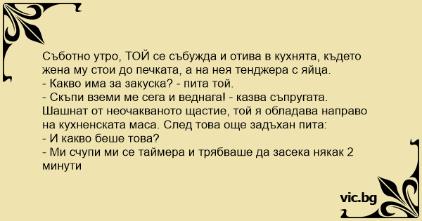 Съботно утро, ТОЙ се събужда и отива в кухнята, където жена му стои до печката, а на нея тенджера с яйца.