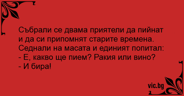 Събрали се двама приятели да пийнат и да си припомнят старите времена.