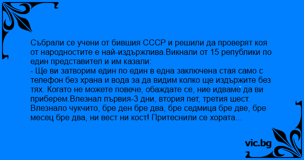 Събрали се учени от бившия СССР и решили да проверят коя от народностите е най-издържлива.Викнали от 15 републики по един представител и им казали: