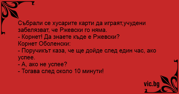 Събрали се хусарите карти да играят,учудени забелязват, че Ржевски го няма.