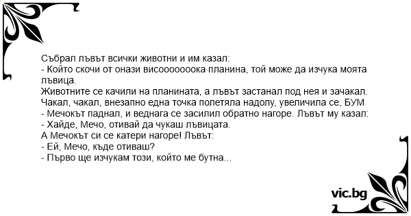 - Който скочи от онази висооооооока планина, той може да изчука моята лъвица.