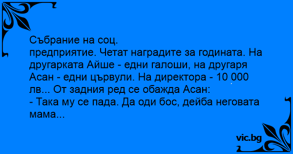 предприятие. Четат наградите за годината. На другарката Айше - едни галоши, на другаря Асан - едни цървули. На директора - 10 000 лв... От задния ред се обажда Асан: