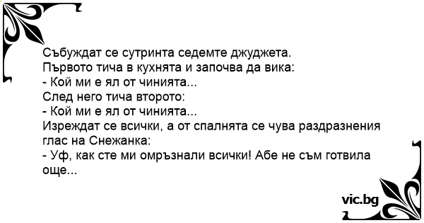 Изреждат се всички, а от спалнята се чува раздразнения глас на Снежанка: