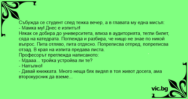 Някак се добира до университета, влиза в аудиторията, тегли билет, сяда на катедрата. Поглежда и разбира, че нищо не знае по никой въпрос. Пита отляво, пита отдясно. Попреписва отпред, попреписва отзад. В края на изпита предава листа.