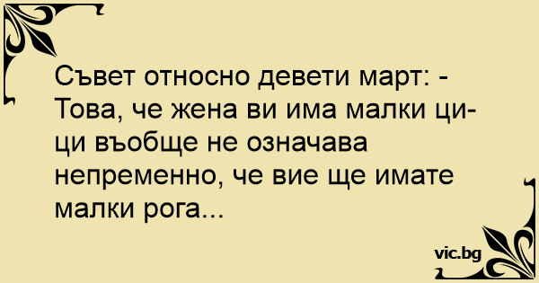 Съвет относно девети март: - Това, че жена ви има малки цици въобще не означава непременно, че вие ще имате малки рога...