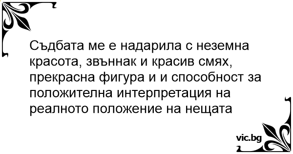 Съдбата ме е надарила с неземна красота, звъннак и красив смях, прекрасна фигура и и способност за положителна интерпретация на реалното положение на нещата