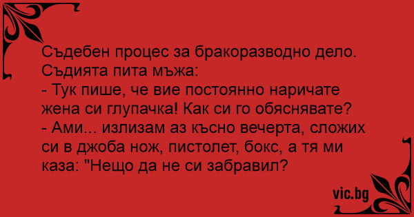 Съдебен процес за бракоразводно дело. Съдията пита мъжа: