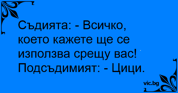 Sulaikytas jaunuolis. Policininkas sako: - Viskas, ką pasakysite, bus panaudota prieš jus teisme. Jaunuolis: - Nuoga merga...