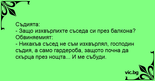 - Никакъв съсед не съм изхвърлял, господин съдия, а само гардероба, защото почна да скърца през нощта... И ме събуди.