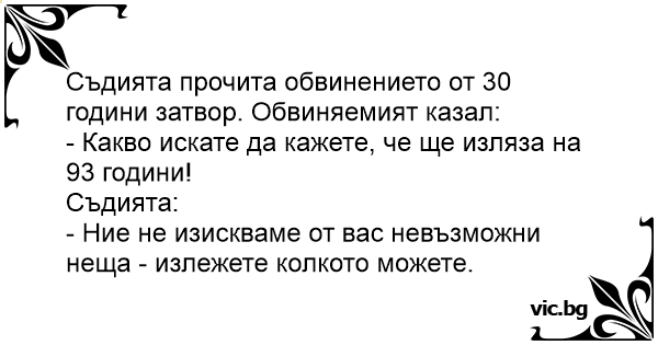 Суддя виносить обвинувачуваному вирок - 25 років. Обвинувачуваний: - Так ви що, мені ж 83 роки! Суддя: - Ми не вимагаємо від вас неможливого - відсидите, скільки зможете.