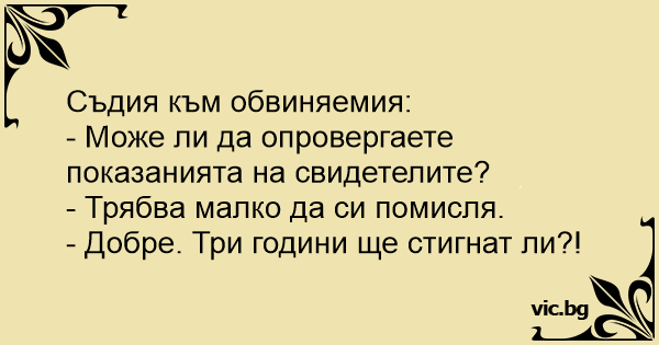 Суддя - обвинуваченому: - Як ви можете спростувати свідчення свідків? - Мені потрібен час, щоб це обміркувати. - Добре. Вам п'ять років вистачить?