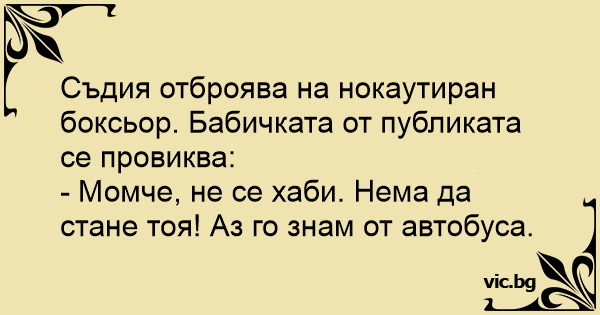 Съдия отброява на нокаутиран боксьор. Бабичката от публиката се провиква: