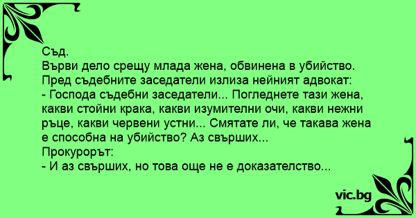 - Господа съдебни заседатели... Погледнете тази жена, какви стойни крака, какви изумителни очи, какви нежни ръце, какви червени устни... Смятате ли, че такава жена е способна на убийство? Аз свърших...
