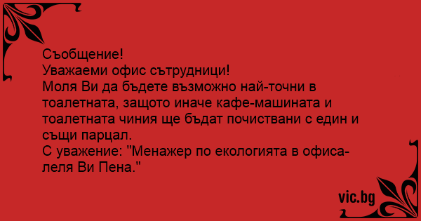 С уважение: "Менажер по екологията в офиса-леля Ви Пена."