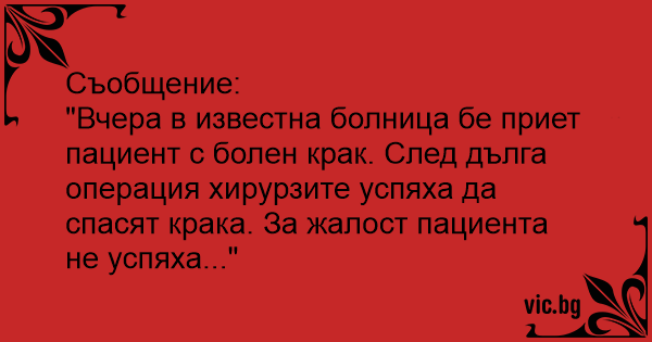 "Вчера в известна болница бе приет пациент с болен крак. След дълга операция хирурзите успяха да спасят крака. За жалост пациента не успяха..."