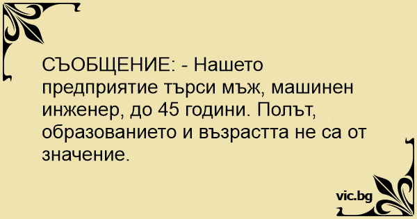 СЪОБЩЕНИЕ: - Нашето предприятие търси мъж, машинен инженер, до 45 години. Полът, образованието и възрастта не са от значение.