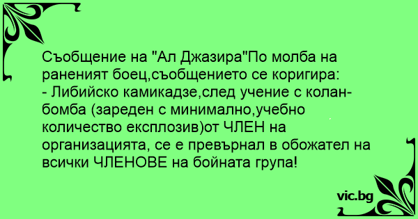 - Либийско камикадзе,след учение с колан-бомба (зареден с минимално,учебно количество експлозив)от ЧЛEH на организацията, се е превърнал в обожател на всички ЧЛЕНОВЕ на бойната група!