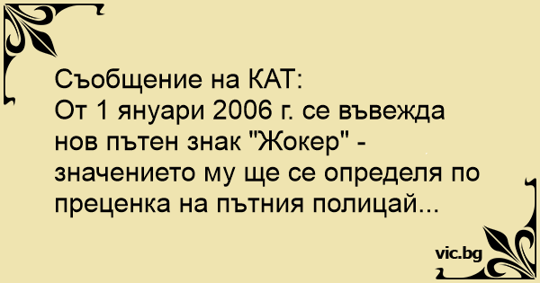 От 1 януари 2006 г. се въвежда нов пътен знак "Жокер" - значението му ще се определя по преценка на пътния полицай...