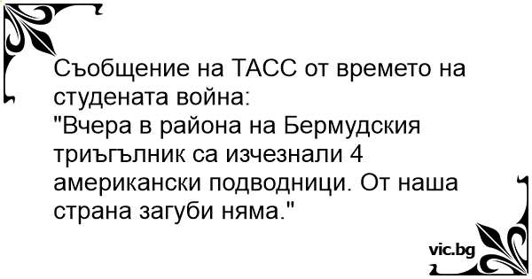"Вчера в района на Бермудския триъгълник са изчезнали 4 американски подводници. От наша страна загуби няма."