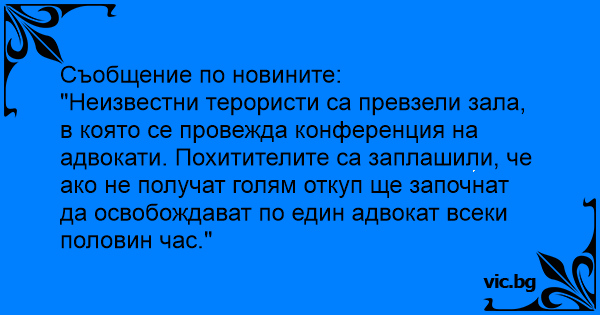 "Неизвестни терористи са превзели зала, в която се провежда конференция на адвокати. Похитителите са заплашили, че ако не получат голям откуп ще започнат да освобождават по един адвокат всеки половин час."